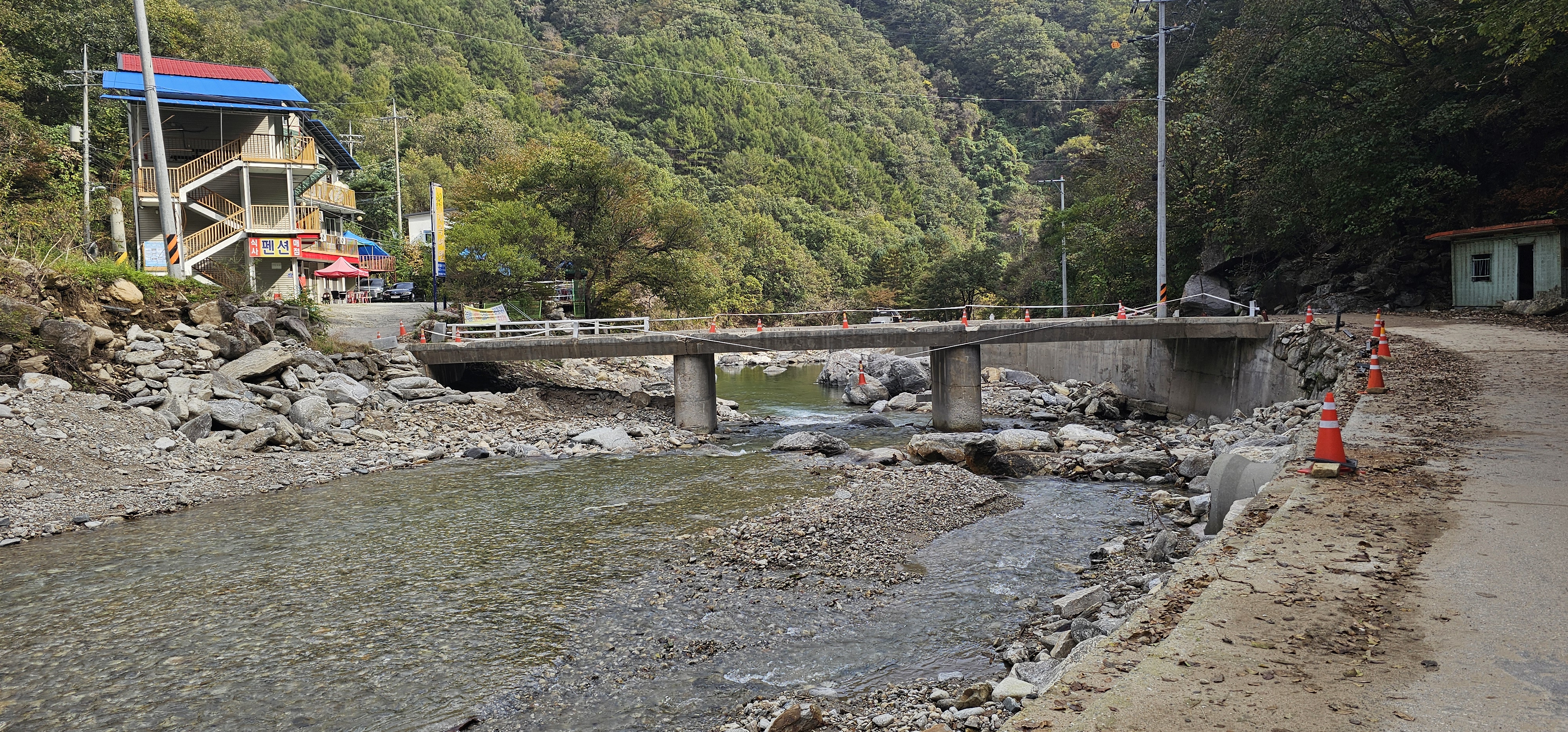 끝부분이 불어난 계곡물 때문에 끊어져 있다.