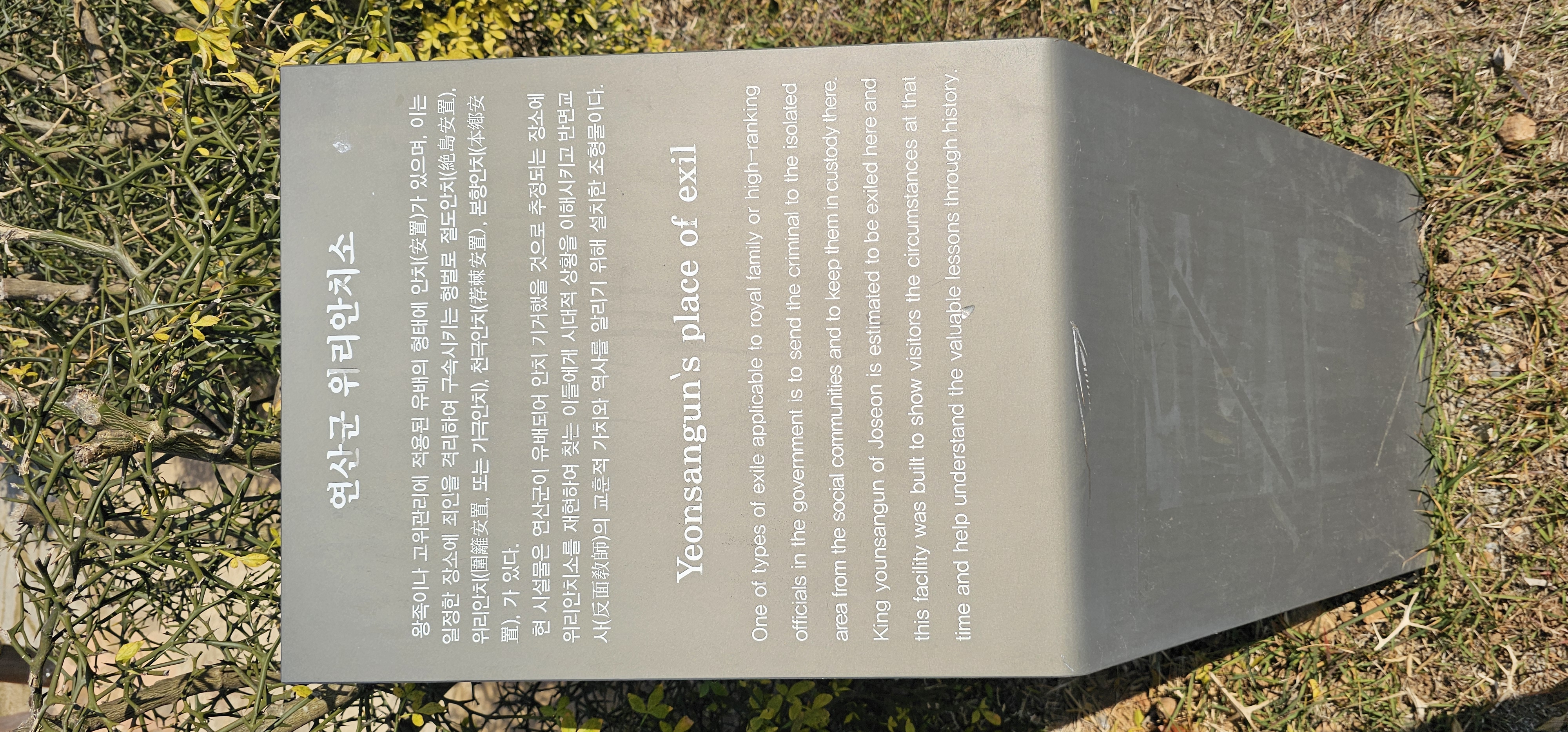 현 시설물은 연산군이 유배되어 안치 되었을 것으로 추정되는 장소에 위리안치를 재현하여 찾는 이들에게 시대적 상황을 이해시키고 반면교사(反面敎師)의 교훈적 가치와 역사를 일리기 위해 설치한 조형물이다.