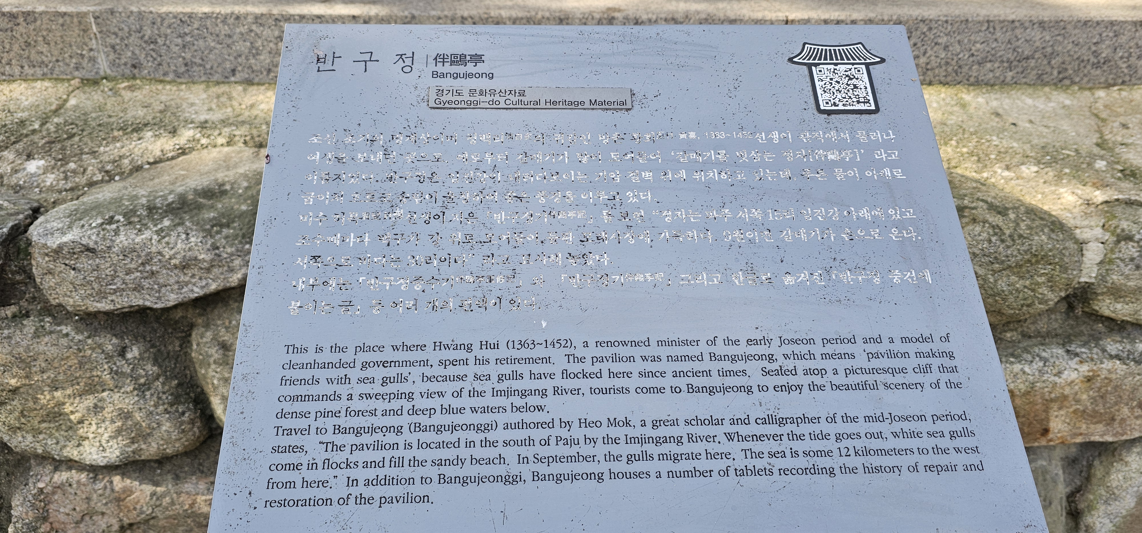 아내와 평화누리길을 걸으면서 가다.반구정은 황희 정승의 유적지로 위키백과에 의하면"반구정은 조선 세종 때 유명한 정승이었던 황희(1363∼1452)가 관직에서 물러나 갈매기를 친구 삼아 여생